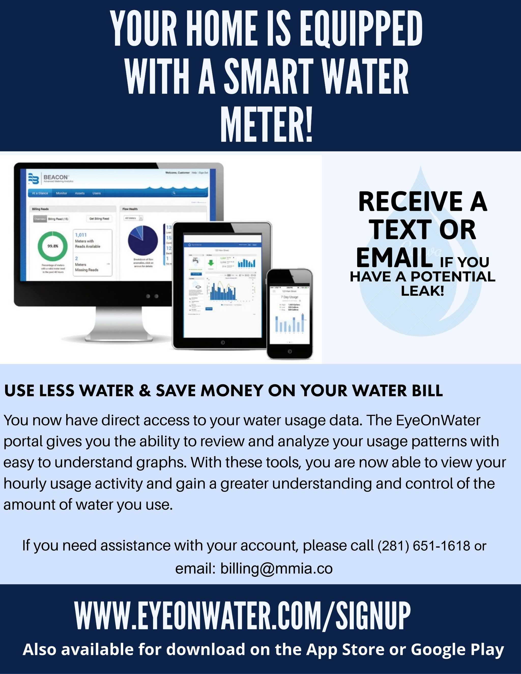 Additional information on accessing and using the EyeOnWater app will be provided once installation is complete. The Board appreciates your patience and cooperation as this important infrastructure upgrade is completed and looks forward to providing enhanced service and greater transparency through the new smart meter system.